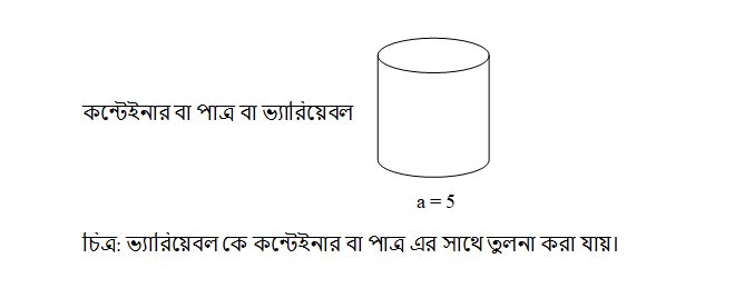 পাইথন ভ্যারিয়েবল কে কন্টেইনার বা পাত্র এর সাথে তুলনা করা যায়। পাত্র এর মধ্যে যেমনি মালামাল স্টোর করে রাখা যায়, তেমনি ভ্যারিয়েবল এর মধ্যে ভ্যালু স্টোর করে রাখা যায়। নিচে চিত্রের সাহায্যে ভ্যারিয়েবল দেখানো হলো, যেখানে a একটি ভ্যারিয়েবল, যার মধ্যে ভ্যালু 5 এসাইন করা হয়েছে (স্টোর করে রাখা হয়েছে)। পাত্র রাখতে যেভাবে একটি জায়গা এর প্রয়োজন হয়, একইভাবে এই ভ্যারিয়েবলটি এর জন্য ও মেমরিতে একটি জায়গা এর দরকার হবে, যে প্রক্রিয়া এর মাধ্যমে এই কাজটি সম্পন্ন হয় তাকে মেমরি অ্যালোকেশন বলা হয়।