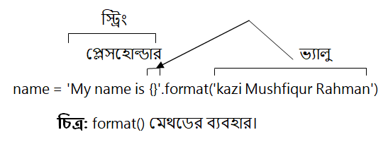এখানে উল্লেখ্য যে, স্ট্রিংয়ের মধ্যেই প্লেসহোল্ডার: { } বসাতে হয়, তারপর format() মেথডের ভেতরে তার সংশ্লিষ্ট ভ্যালু উল্লেখ করতে হয়। এখন আমরা উদাহরণসহ মেথডটির ব্যবহার দেখব।
