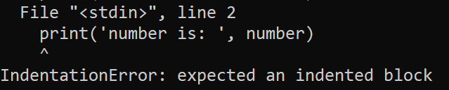 এখানে আমি হুবহু উপরের কোডই ব্যবহার করেছি, তবে তৃতীয় লাইনে ইন্ডেন্টেশন (কোডের লাইনের শুরুতে ৪ টি হোয়াইট স্পেস) মেইনটেইন করিনি। তাই পাইথন একটি এরর মেসেজ (IndentationError: expected an indented block) শো করবে। মেসেজটির অর্থ হলো: ‘একটি ইন্ডেন্টেড ব্লক প্রত্যাশিত’, অর্থাৎ লাইনটি ৪ টি হোয়াইট স্পেস দিয়ে শুরু হতে হবে। এখন কোডটি রান করলে নিচের মত আউটপুট দিবে।