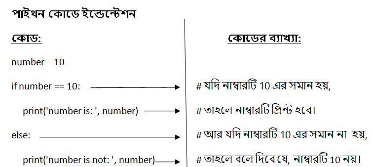 উপরের কোডের প্রথম লাইনে number ভ্যারিয়েবল এর মধ্যে 10 এসাইন করা হয়েছে, দ্বিতীয় লাইনে চেক করা হয়েছে যে, নাম্বারটি 10 এর সমান কি না। যেহেতু এক্ষেত্রে নাম্বারটি 10 এর সমান, তাই এ কন্ডিশনটি True হবে এবং এর অধীনে পরবর্তী লাইন প্রিন্ট হবে (কাজ করবে)। তৃতীয় লাইনে কোডটি স্পেস দিয়ে শুরু হয়েছে, এটাই হলো কোডের ইন্ডেন্টেশন (কোডের লাইনের শুরুতে ৪ টি হোয়াইট স্পেস)। চতুর্থ লাইনে (else অর্থ: অন্যথায়) চেক করা হয়েছে যে, যদি নাম্বারটি 10 এর সমান না হয়, তাহলে কন্ডিশনটি False হবে। যেহেতু এক্ষেত্রে নাম্বারটি 10 এর সমান নয়, তাই এ কন্ডিশনটি False হয়েছে এবং এর অধীনে পরবর্তী লাইন (কাজ করেনি) প্রিন্ট হয়নি।