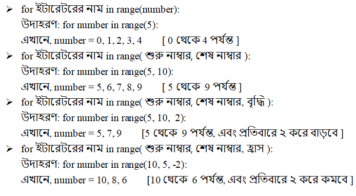 ফরমেট ৩: for ইটারেটরের নাম in range( শুরু নাম্বার, শেষ নাম্বার, বৃদ্ধি ):