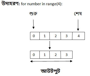 উপরের কোডের প্রথম লাইনে আমি একটি ফর লুপ ডিফাইন করেছি, এবং range() ফাংশনের মধ্যে 4 দিয়েছি, যার অর্থ হলো: লুপটি চারবার চলবে, তবে এর কাউন্টিং শুরু হবে 0 থেকে (0 থেকে 3 পর্যন্ত)। তখন ইটারেটর, number এর ভ্যালু হবে একে একে ৪ টি (সুতরাং ইটারেশন সংখ্যা চার):