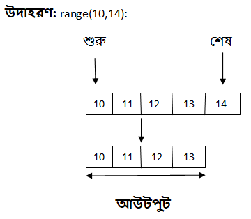 উপরের কোডের প্রথম লাইনে আমি একটি ফর লুপ ডিফাইন করেছি, এবং range() ফাংশনের মধ্যে 10, 14 দিয়েছি (10 শুরু এবং 14 শেষ নির্দেশ করে), যার অর্থ হলো: লুপটি চারবার চলবে, তবে এর কাউন্টিং শুরু হবে 10 থেকে (10 থেকে 14 পর্যন্ত)। তখন ইটারেটর, number এর ভ্যালু হবে একে একে ৪ টি (সুতরাং ইটারেশন সংখ্যা চার):