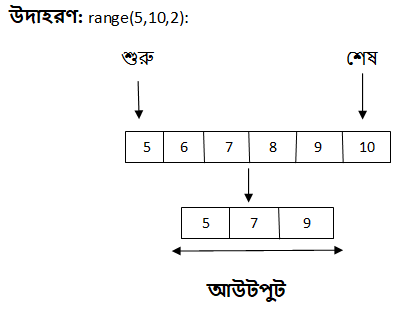 উপরের কোডের প্রথম লাইনে আমি একটি ফর লুপ ডিফাইন করেছি, এবং range() ফাংশনের মধ্যে 5, 10, 2 দিয়েছি (5 শুরু, 10 শেষ এবং 2 বৃদ্ধি নির্দেশ করে), যার অর্থ হলো: লুপটি তিনবার চলবে, তবে এর কাউন্টিং শুরু হবে 5 থেকে (5 থেকে 9 পর্যন্ত), এবং প্রত্যেকবারে দুই করে বাড়বে। তখন ইটারেটর, number এর ভ্যালু হবে একে একে তিনটি (সুতরাং ইটারেশন সংখ্যা তিন):