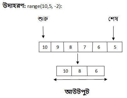 উপরের কোডের প্রথম লাইনে আমি একটি ফর লুপ ডিফাইন করেছি, এবং range() ফাংশনের মধ্যে 10, 5, -2 দিয়েছি (10 শুরু, 5 শেষ এবং -2 হ্রাস নির্দেশ করে), যার অর্থ হলো: লুপটি তিনবার চলবে, তবে এর কাউন্টিং শুরু হবে 10 থেকে (10 থেকে 6 পর্যন্ত), এবং প্রত্যেকবারে দুই করে কমবে। তখন ইটারেটর, number এর ভ্যালু হবে একে একে তিনটি (সুতরাং ইটারেশন সংখ্যা তিন):