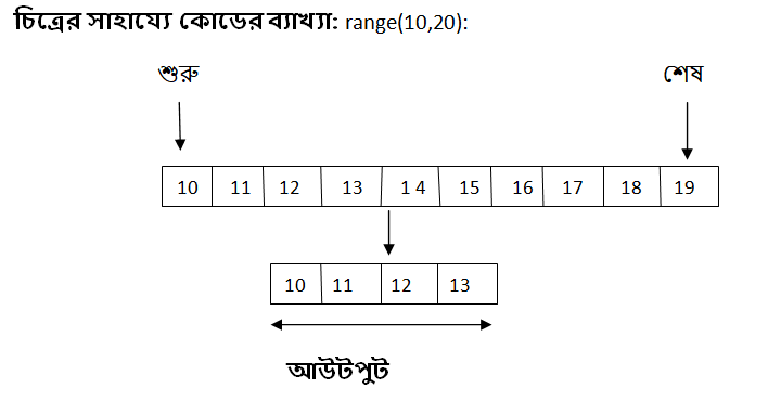উপরের কোডের প্রথম লাইনে আমি একটি স্ট্রিং প্রিন্ট করেছি। দ্বিতীয় লাইনে একটি ফর লুপ ডিফাইন করেছি যা (10 থেকে 19 পর্যন্ত) ১০টি সংখ্যা প্রিন্ট করবে। তৃতীয় লাইনে ‘ if ’ এর পরে একটি কন্ডিশন (number == 14: অর্থ: যদি নাম্বারটি 14 হয়) দিয়ে চেক করেছি যে, যদি নাম্বারটি 14 হয়, তাহলে চতুর্থ লাইনটি (break স্টেটমেন্ট) এক্সিকিউট কর। অর্থাৎ লুপটি বন্ধ করে দাও।