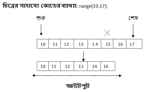 উপরের কোডের প্রথম লাইনে আমি একটি স্ট্রিং প্রিন্ট করেছি। দ্বিতীয় লাইনে একটি ফর লুপ ডিফাইন করেছি যা (10 থেকে 16 পর্যন্ত) ৭টি সংখ্যা প্রিন্ট করবে। তৃতীয় লাইনে ‘ if ’ এর পরে একটি কন্ডিশন (number == 15: অর্থ: যদি নাম্বারটি 15 হয়) দিয়ে চেক করেছি যে, যদি নাম্বারটি 15 হয়, তাহলে চতুর্থ লাইনটি (continue স্টেটমেন্ট) এক্সিকিউট কর। অর্থাৎ 15 প্রিন্ট না করে পরবর্তী সংখ্যা 16 প্রিন্ট কর।
