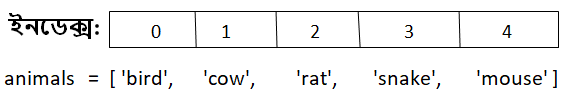 উপরের কোডের প্রথম লাইনে আমি ৫ টি প্রাণীর একটি লিস্ট [ 'bird', 'cow', 'rat', 'snake', 'mouse' ] তৈরী করেছি, যেখানে এর আইটেম গুলোকে কমা দিয়ে পৃথক করেছি। এখানে ৫ টি আইটেম রয়েছে যার প্রত্যেকটি একটি স্ট্রিং। দ্বিতীয় লাইনে লিস্টটি প্রিন্ট করেছি। এখন কোডটি রান করলে নিচের মত আউটপুট পাব।